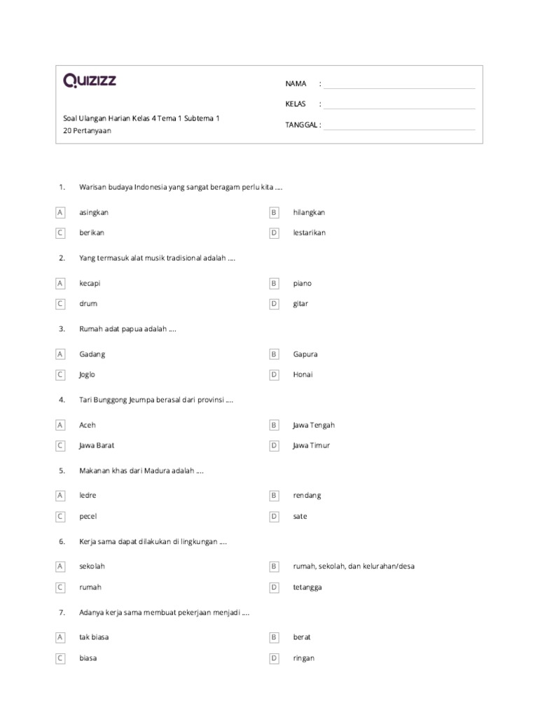 - Mengukur pemahaman siswa tentang keberagaman budaya Indonesia, termasuk pakaian adat, rumah adat, makanan tradisional, dan kesenian daerah.