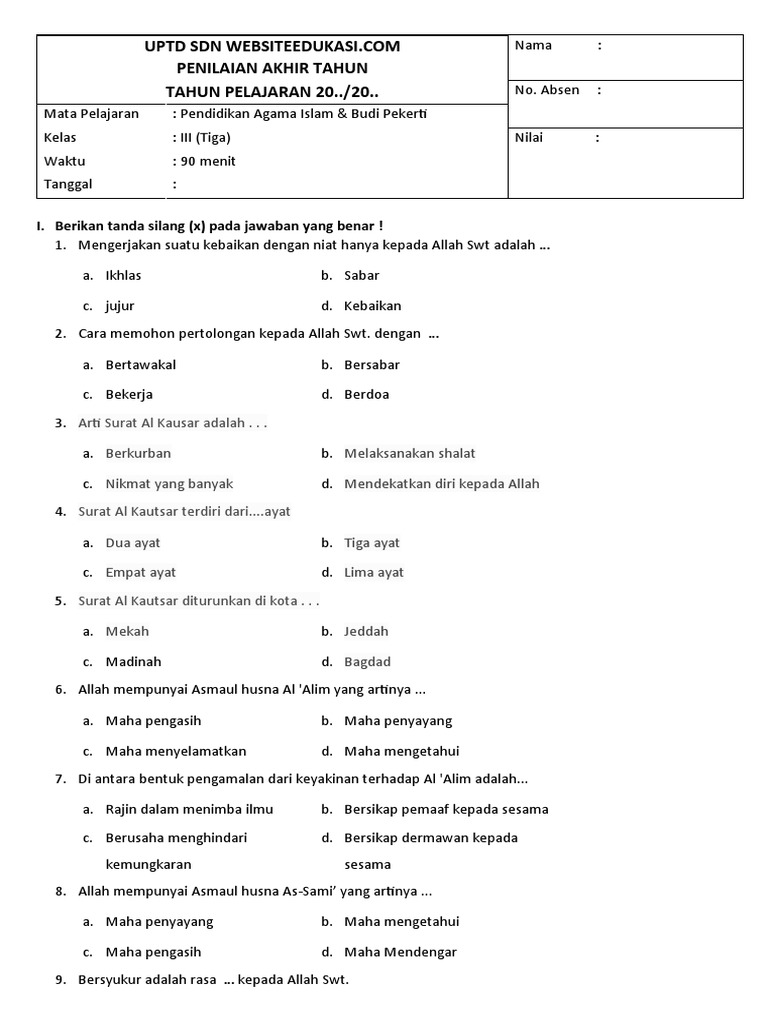 - Pendidikan Agama dan Budi Pekerti: Meliputi nilai-nilai keagamaan, ibadah dasar, dan akhlak mulia sesuai dengan agama yang dianut siswa. Soal-soal dapat berupa pilihan ganda tentang kisah-kisah nabi, tata cara beribadah, atau penerapan nilai-nilai moral dalam kehidupan sehari-hari.