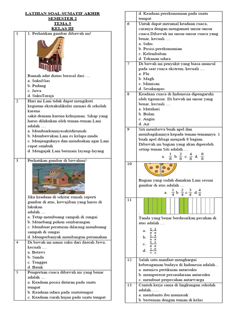 Untuk mengukur pemahaman siswa secara komprehensif, latihan soal tema 5 kelas 3 revisi 2018 sebaiknya menggunakan berbagai jenis soal. Variasi ini tidak hanya menguji kemampuan kognitif siswa, tetapi juga cara mereka mengekspresikan pemahamannya.
